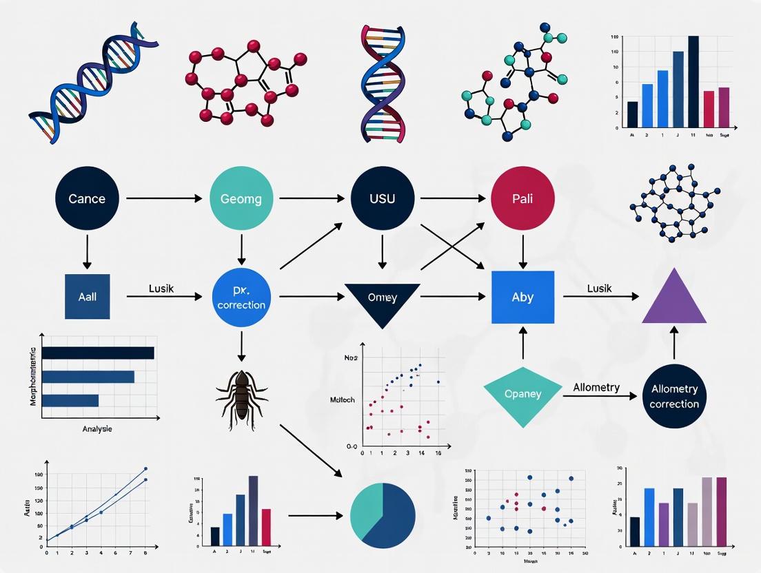 First Principal Component (PC1) of Shape: In this approach, principal component analysis is performed on shape coordinates, and the association between PC1 scores and size is evaluated [4]. A strong correlation suggests that the major axis of shape variation represents allometry, which should be accounted for in subsequent taxonomic analyses.