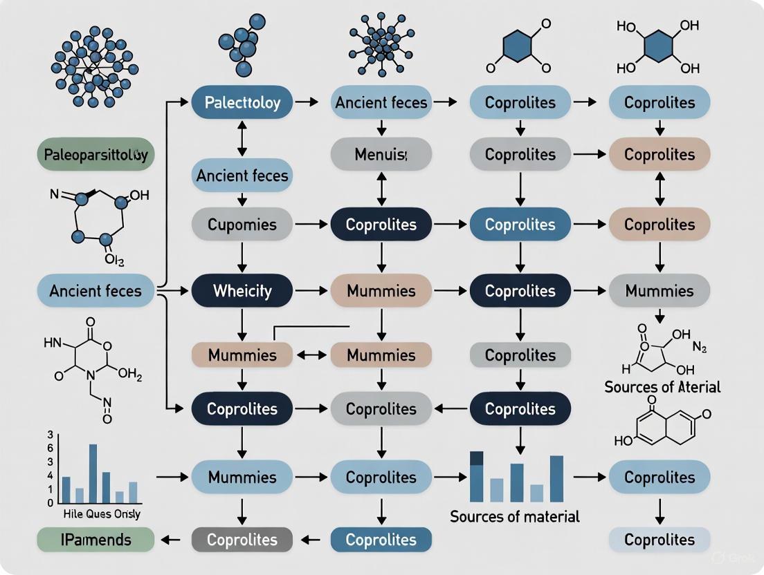 This article provides a comprehensive analysis of the diverse source materials utilized in paleoparasitology, tailored for researchers, scientists, and drug development professionals. It details the foundational archaeological and paleontological contexts for sample collection, explores the advanced methodological pipeline from extraction to analysis, and addresses key challenges in sample preservation and data interpretation. By presenting a comparative framework for material validation, this guide aims to bridge disciplinary gaps, demonstrating how ancient parasite data can inform modern drug discovery, repurposing efforts, and our understanding of long-term host-pathogen evolution.